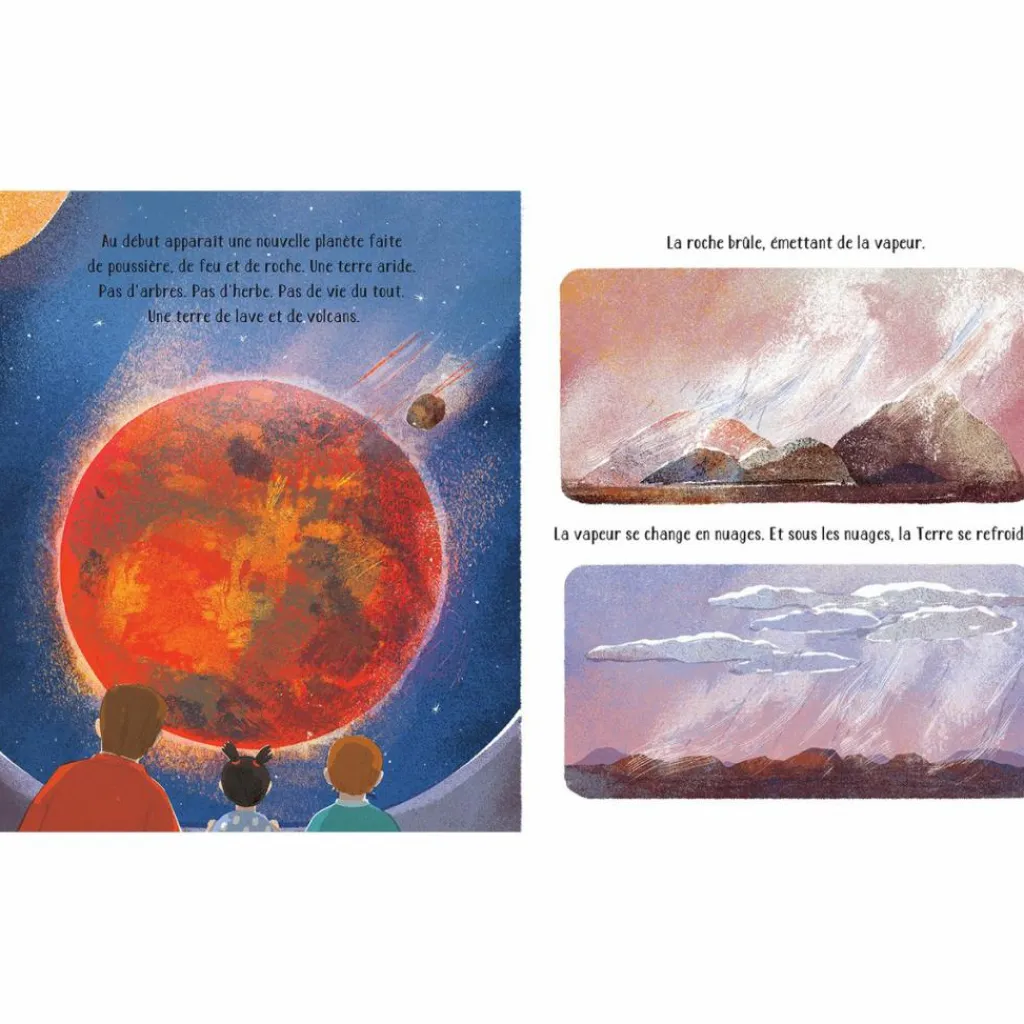 « Qui crée les océans ? Un dieu, un magicien, les lances à eau des pompiers ? » Rejoins un papa et ses deux enfants dans leur promenade et découvre avec eux comment naît un océan. De la vapeur d’eau aux gouttes de pluie, des algues aux animaux marins… Tu verras comment mille et une petites choses peuvent se combiner pour changer la face de la Terre !Au début et à la fin de l’histoire, découvre quels sont les océans dans le monde et leurs différents écosystèmes, l’impact des activités humaines sur eux et ce que tu peux faire pour les protéger.