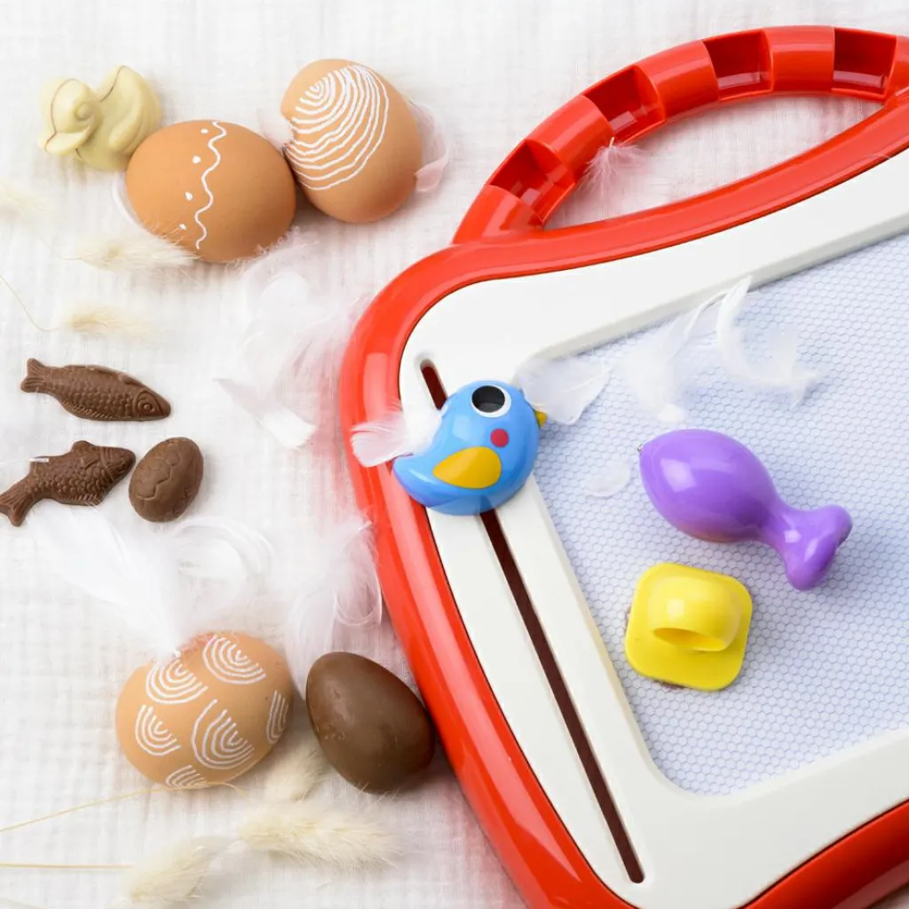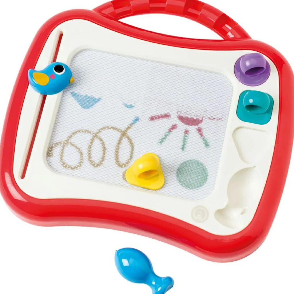 Grâce au stylo parfaitement adapté à ses petites mains, votre enfant va pouvoir écrire et dessiner facilement sur cette ardoise magique. Divisée en quatre parties égales, il dessine, écrit, expérimente ou colorie et les quatre couleurs prennent forme avec un seul stylo. C’est magique et les possibilités sont infinies ! Trois tampons de couleurs et formes différentes l’aident à personnaliser ses créations ou à dessiner des formes parfaites. Et lorsqu’il veut recommencer à zéro, il lui suffit d’abaisser l’oiseau pour effacer son dessin et recommencer à nouveau ! Pratique, la petite poignée de l’ardoise facilite le transport et lui permet d’être ainsi créatif n’importe où, n’importe quand !
