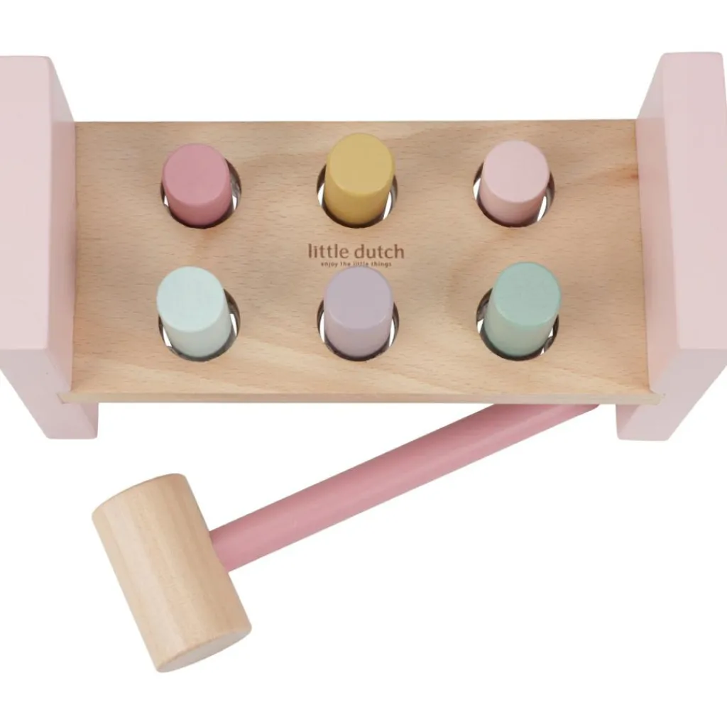 – Tapez avec le marteau pour enfoncer les 6 bâtonnets de couleur dans l’établi en bois.