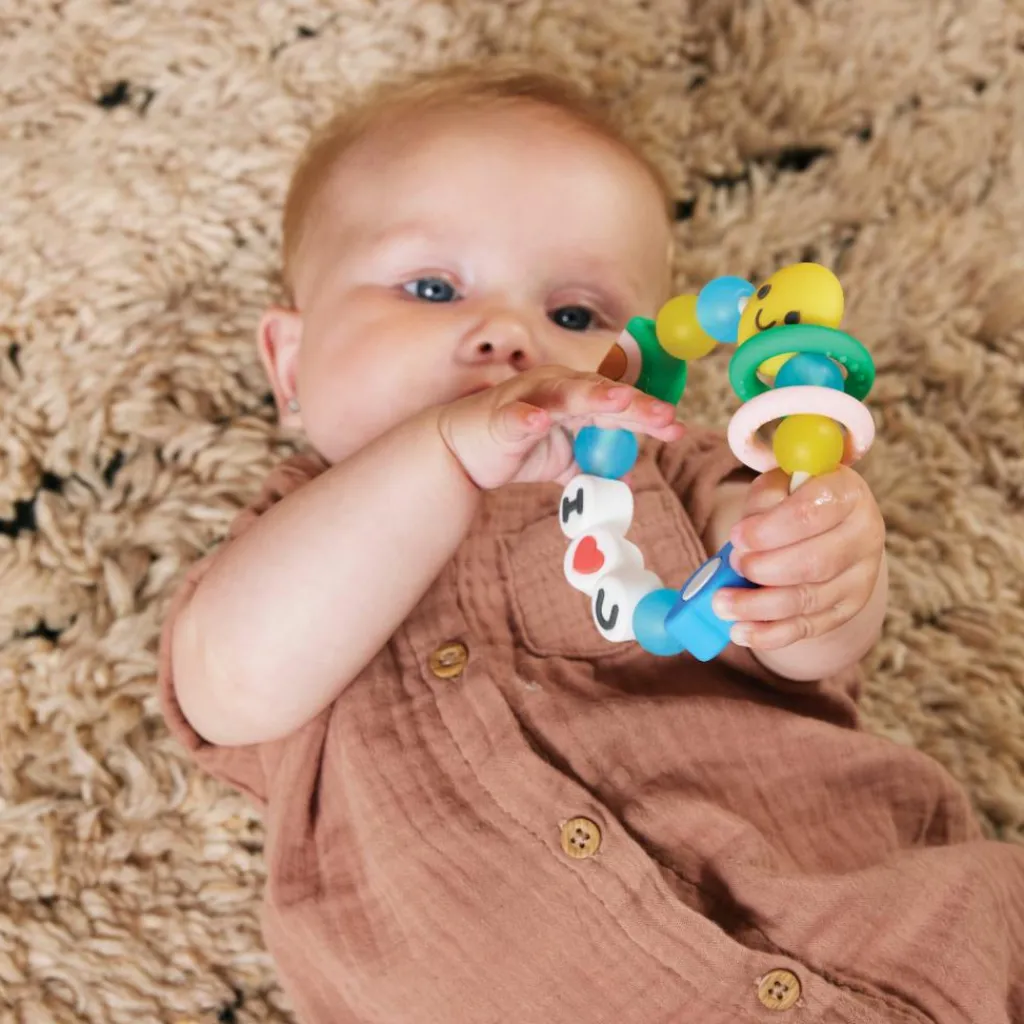 – Ses couleurs éclatantes, ses formes amusantes et texturées encouragent la découverte et offrent simultanément un soulagement lorsque bébé fait ses dents.