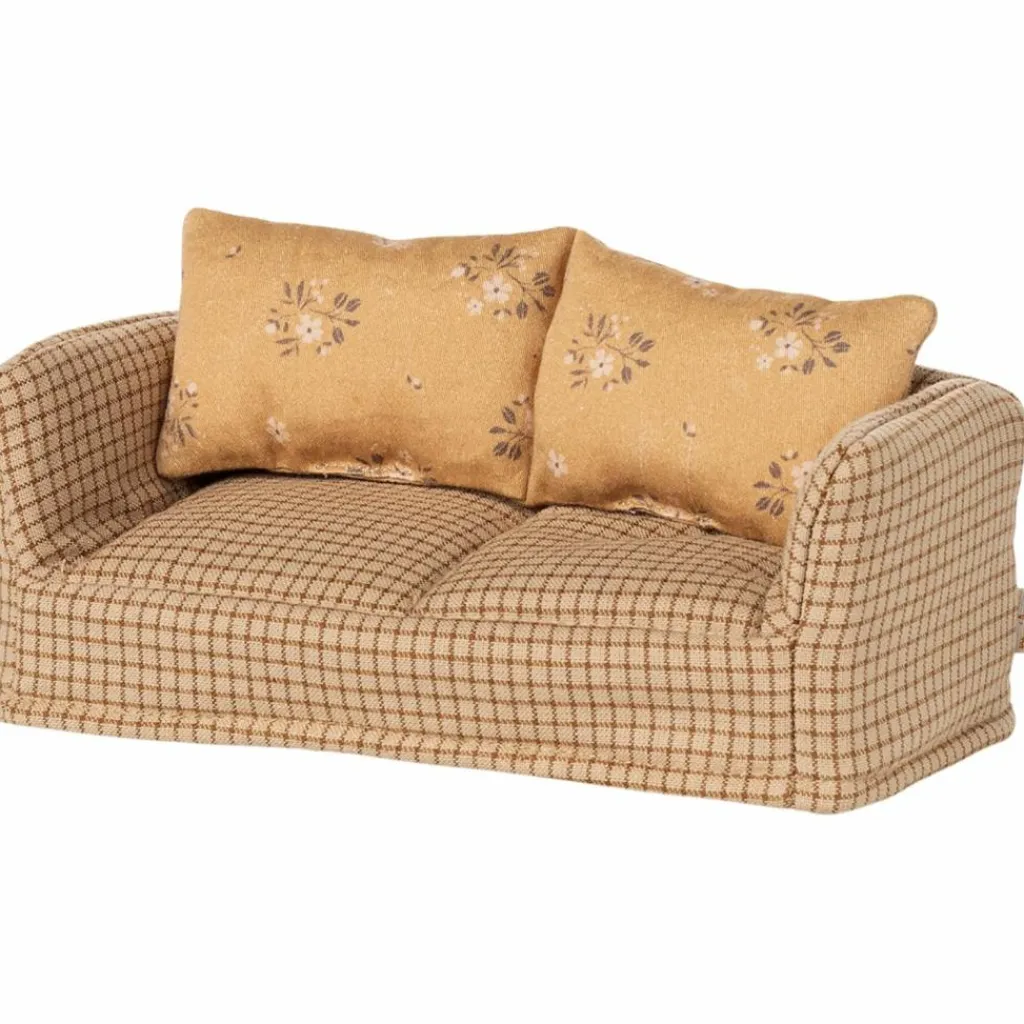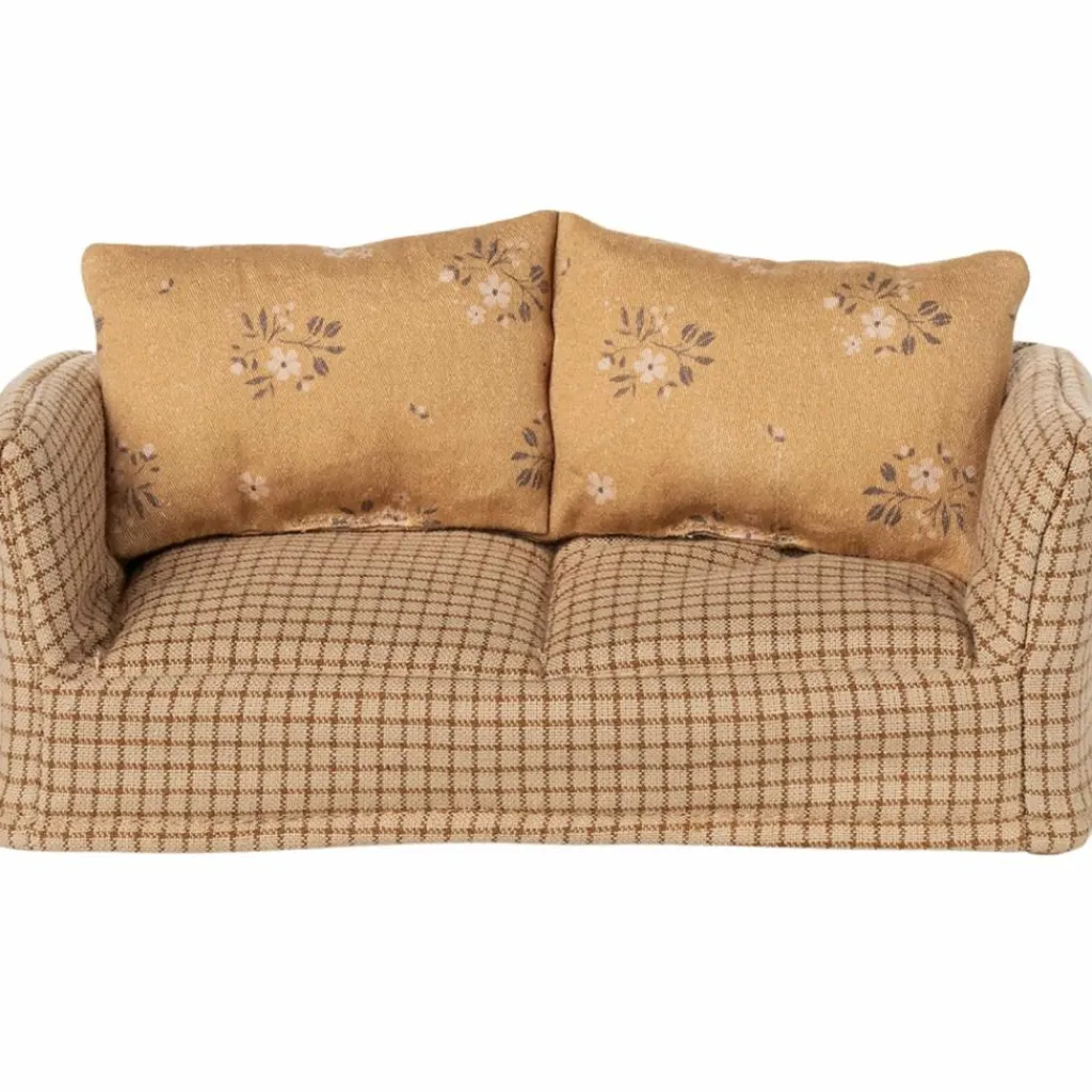 Conçu pour s’intégrer parfaitement dans l’univers miniature des souris Maileg, ce joli canapé au tissu à carreaux beige et aux coussins fleuris crée une atmosphère chaleureuse et vintage. Idéal pour faire vivre mille et une histoires à vos enfants, il transforme chaque moment de jeu en une scène douce et poétique.