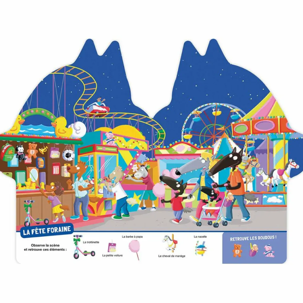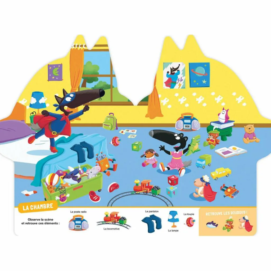 – 8 scènes inédites de la vie quotidienne de P’tit Loup dans lesquelles l’enfant doit chercher des éléments, pour des heures de jeu et pour se familier avec du vocabulaire du quotidien.