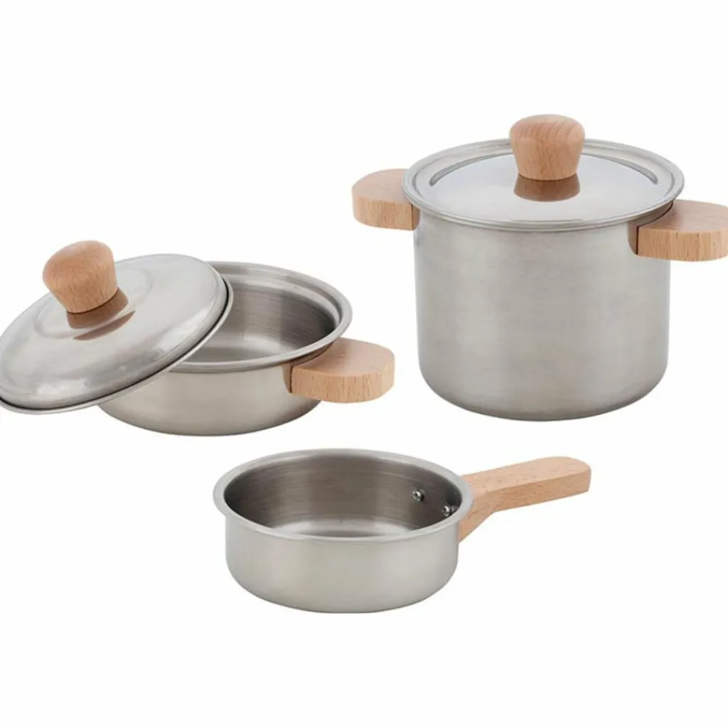 – 1 casserole, 1 cocotte et 1 poêle en métal et bois.