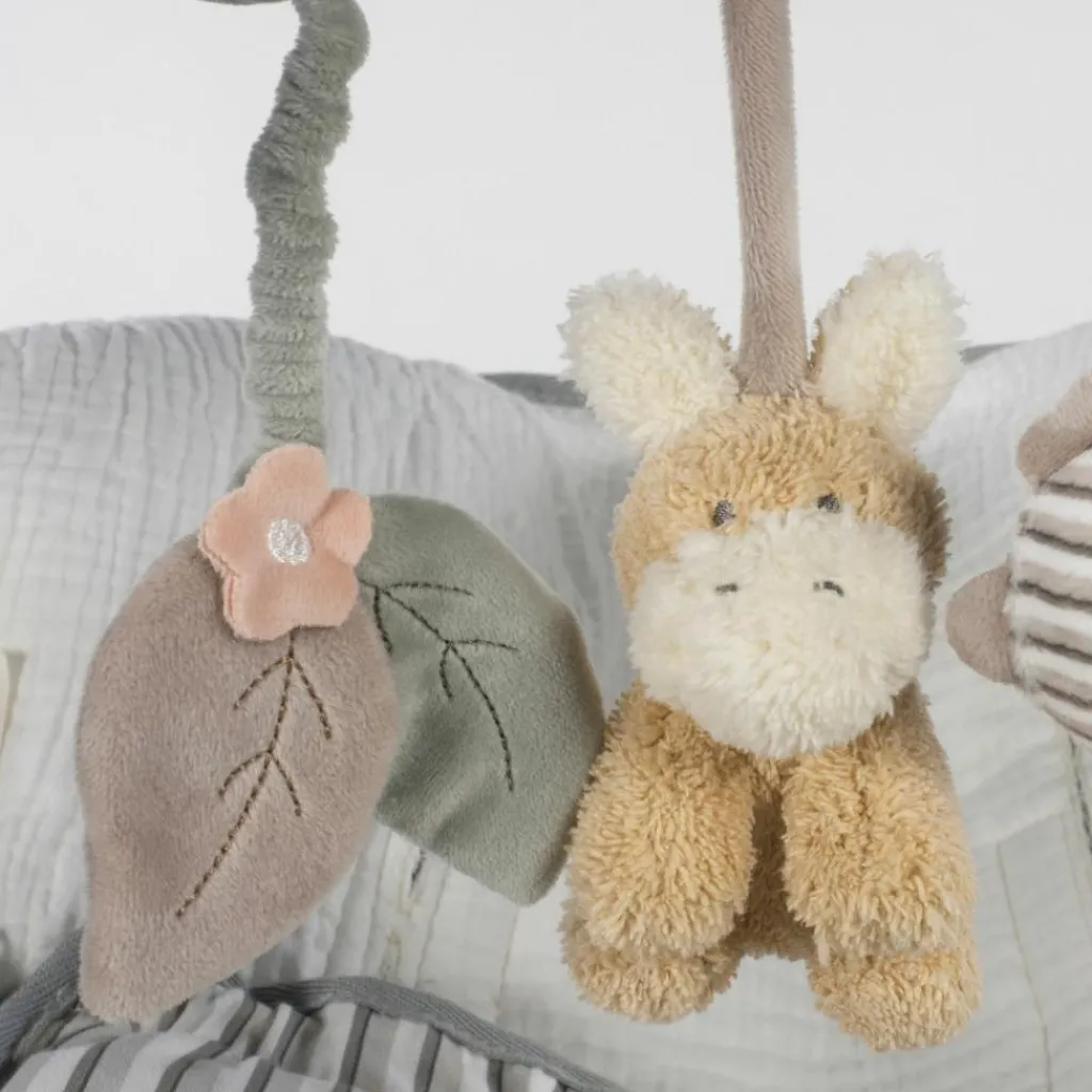 Le petit âne Botton, adorable personnage en peluche, est entouré de petits éléments suspendus aux textures et sons variés. Entre le bruissement des feuilles, le tintement délicat de l’oiseau et la douceur des matières, bébé développe ses sens tout en s’amusant.