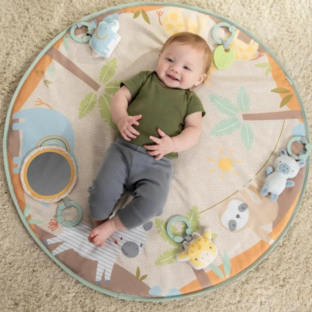 – 5 jouets détachables inclus : Girafe et éléphant à chiffonner, zèbre en peluche, feuille texturée et miroir en tissu. De quoi explorer sons, textures et reflets, tout en favorisant le développement moteur et cognitif.