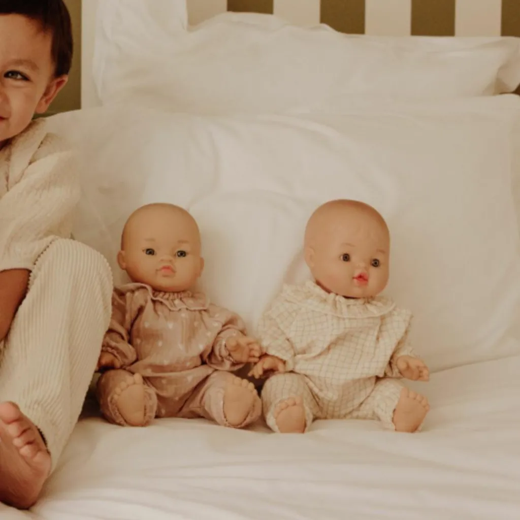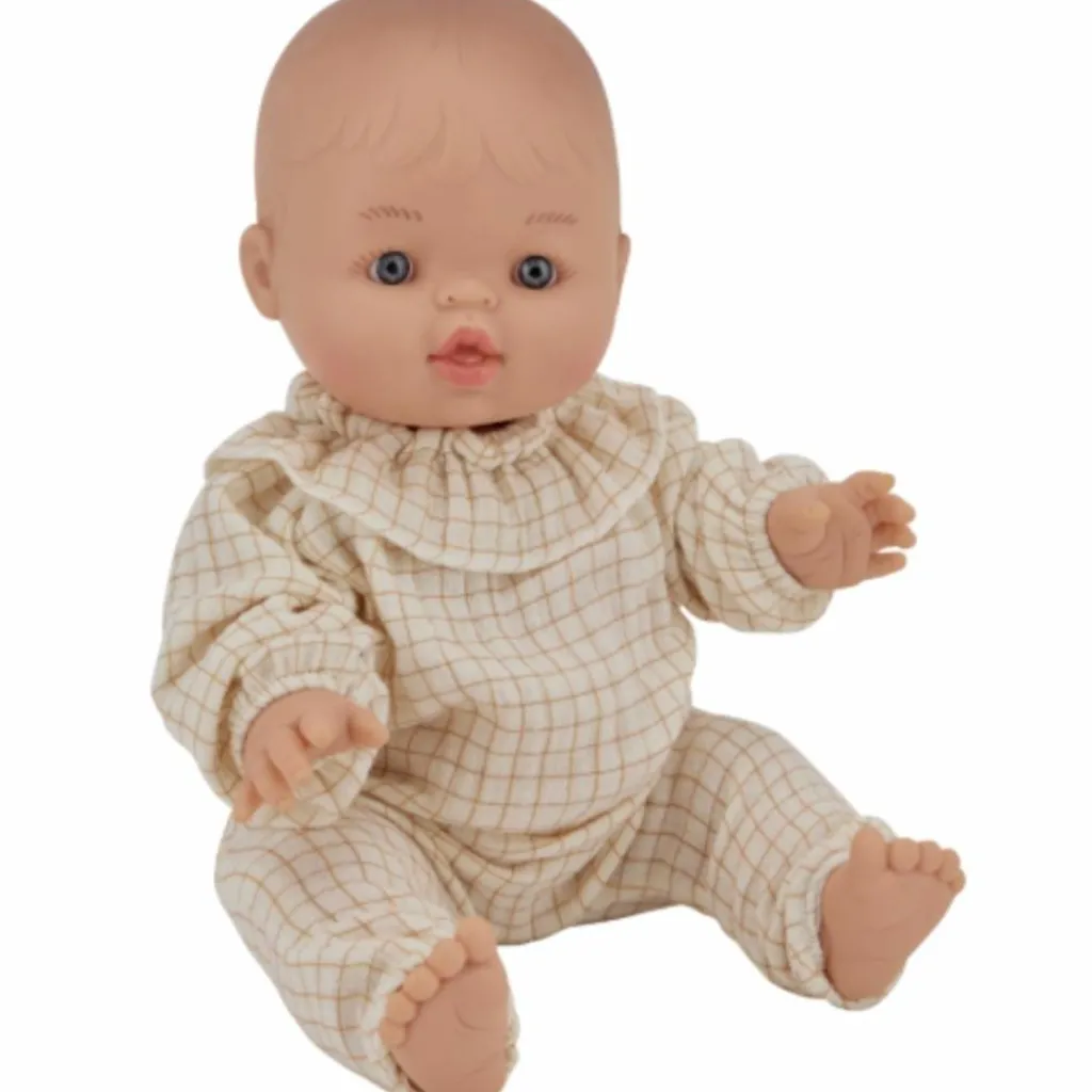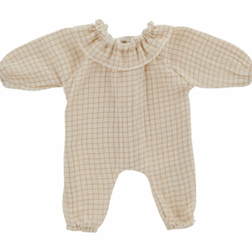 Avec son adorable col et son motif à petits carreaux, cette tenue apporte charme et raffinement aux poupées préférées de votre enfant. Conçue en 100% gaze de coton, elle est douce, légère et agréable à manipuler par les petites mains. Grâce à ses finitions élastiquées aux poignets et aux chevilles, l’habillage devient simple et amusant, favorisant l’autonomie des enfants et stimulant leur imagination.