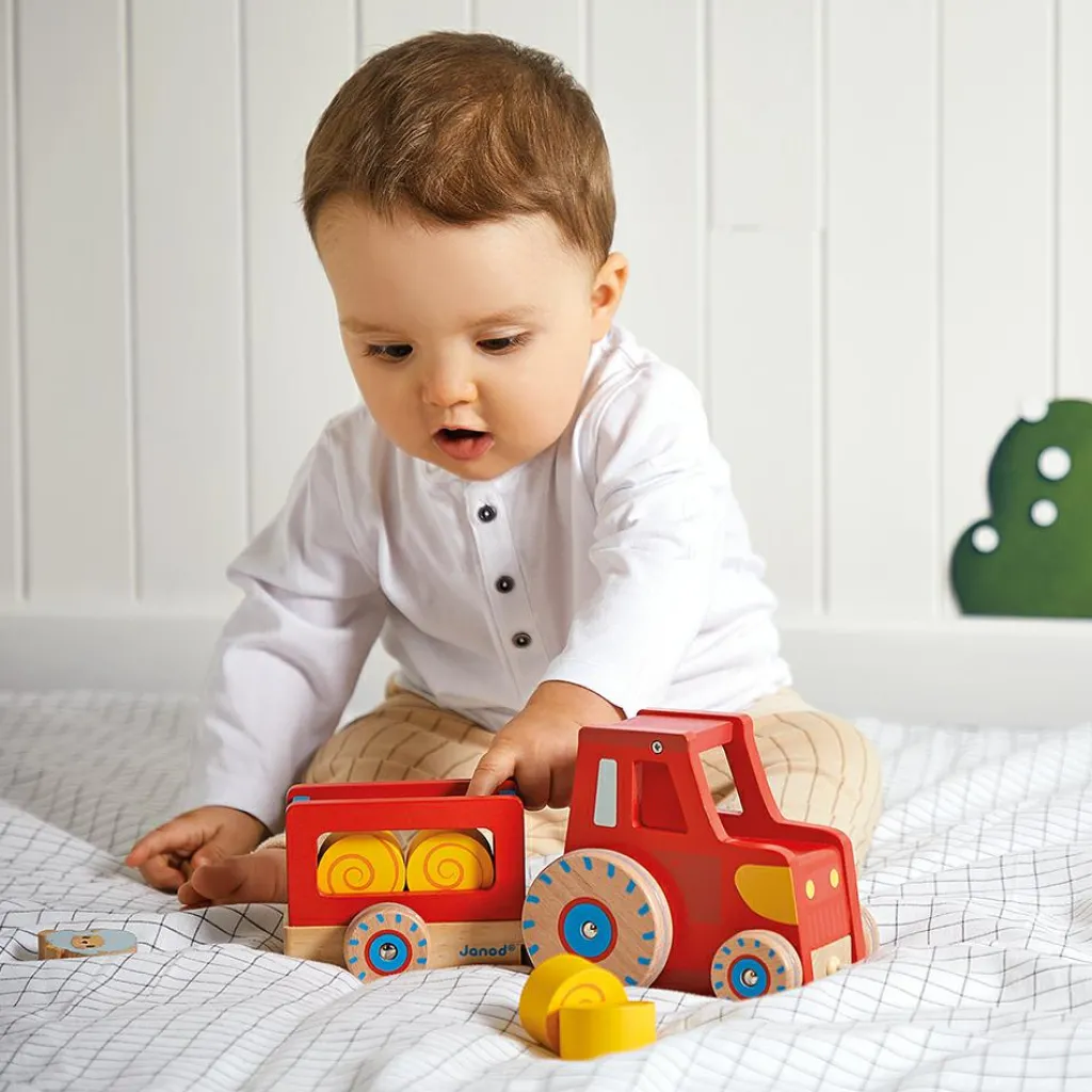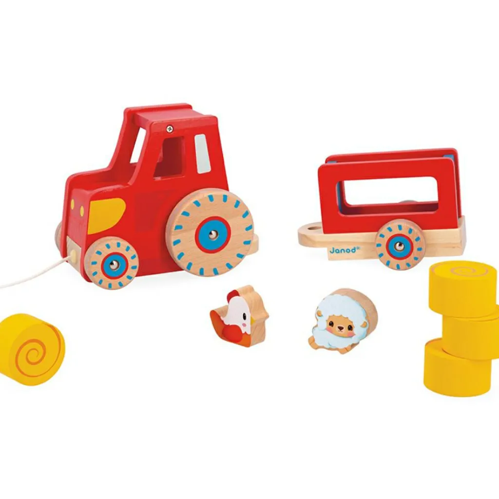 – Comprend 1 tracteur en bois, 1 mouton, 1 poule et 4 bottes de foin.