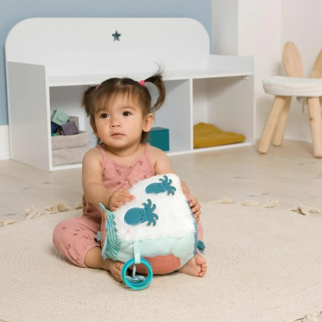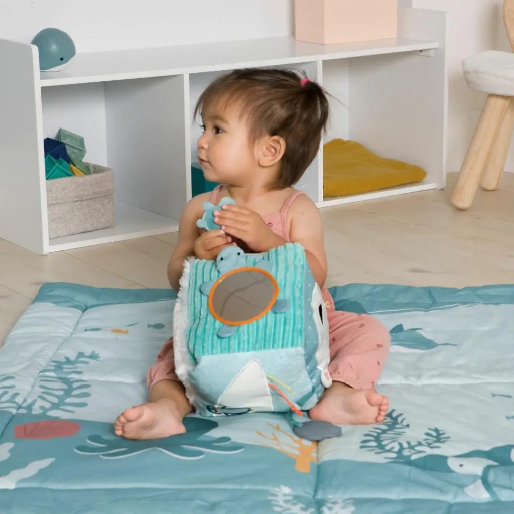 – Plusieurs activités : hochets, jeux de matières, tortue miroir pour y découvrir son reflet, matières ultra douces, détails brodés, 2 anneaux de dentition, petite tortue qui se cache dans le coquillage, tentacules de la pieuvre mobiles.