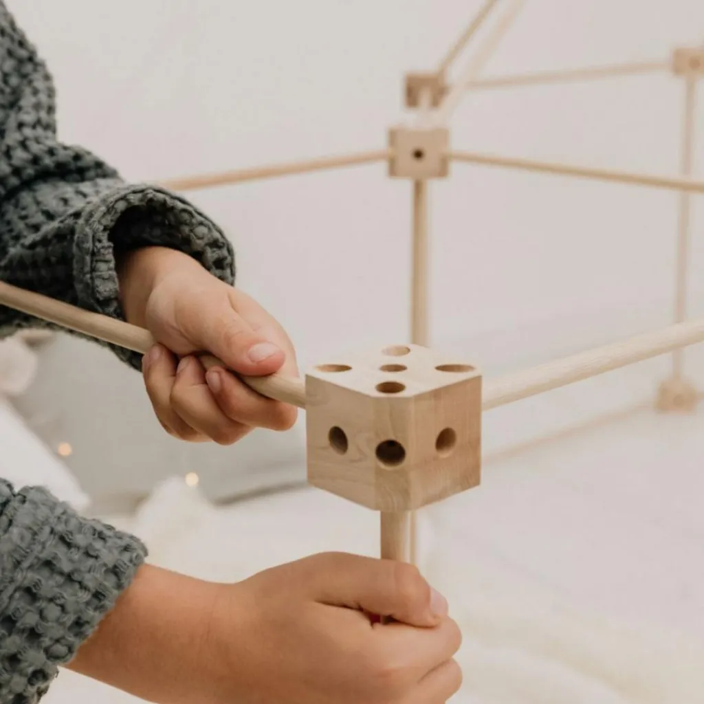 – Des pièces en bois brut – Comme tous les kits de construction 1001 Cabanes, ce pack contient 2 modèles de pièce en bois : des tiges et des connecteurs en forme de pavé rectangulaire percés de 18 trous.