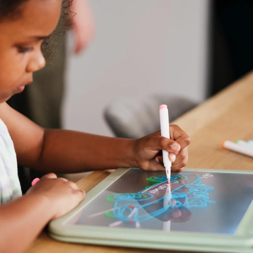 Kit de marqueurs effaçables aux couleurs fluorescentes pour dessiner sur le tableau noir de la KIDYDRAW-PRO. Ils mettant en avant un effet néon qui sublimeront les couleurs des dessins de vos enfants dans l’obscurité.