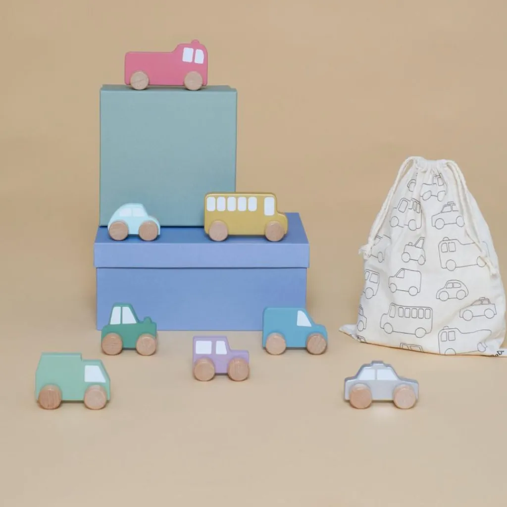 – Contient 8 véhicules en bois de taille et de couleur différente dans un sac en coton à imprimé véhicules.