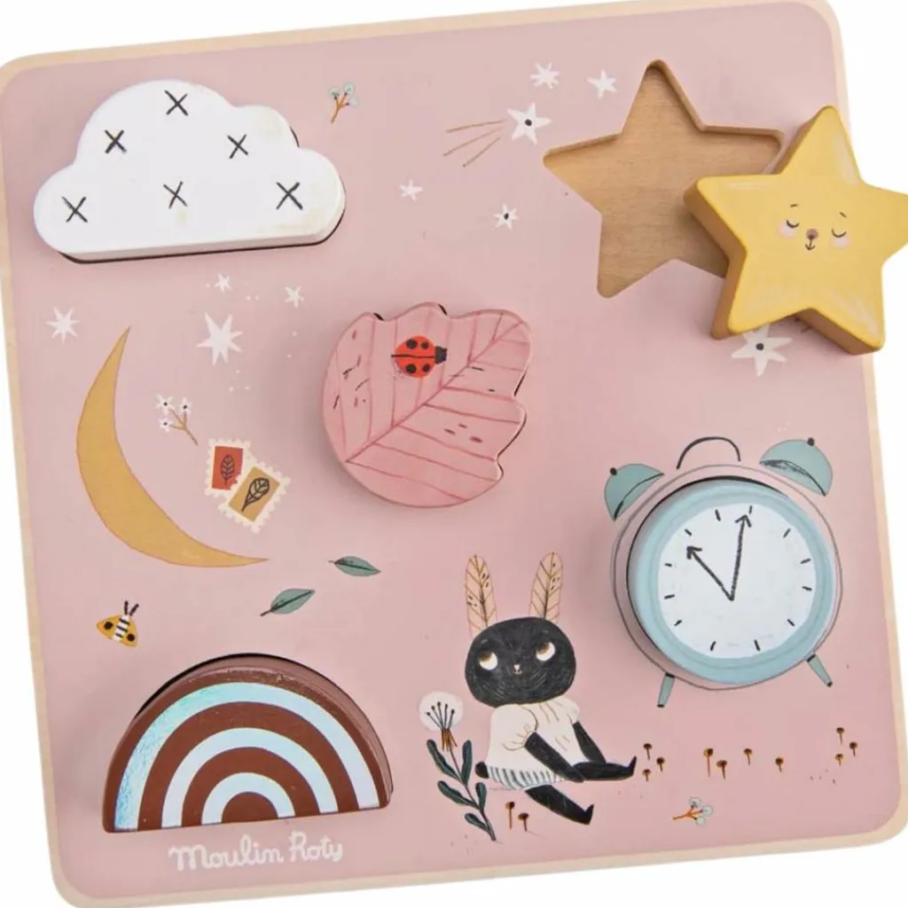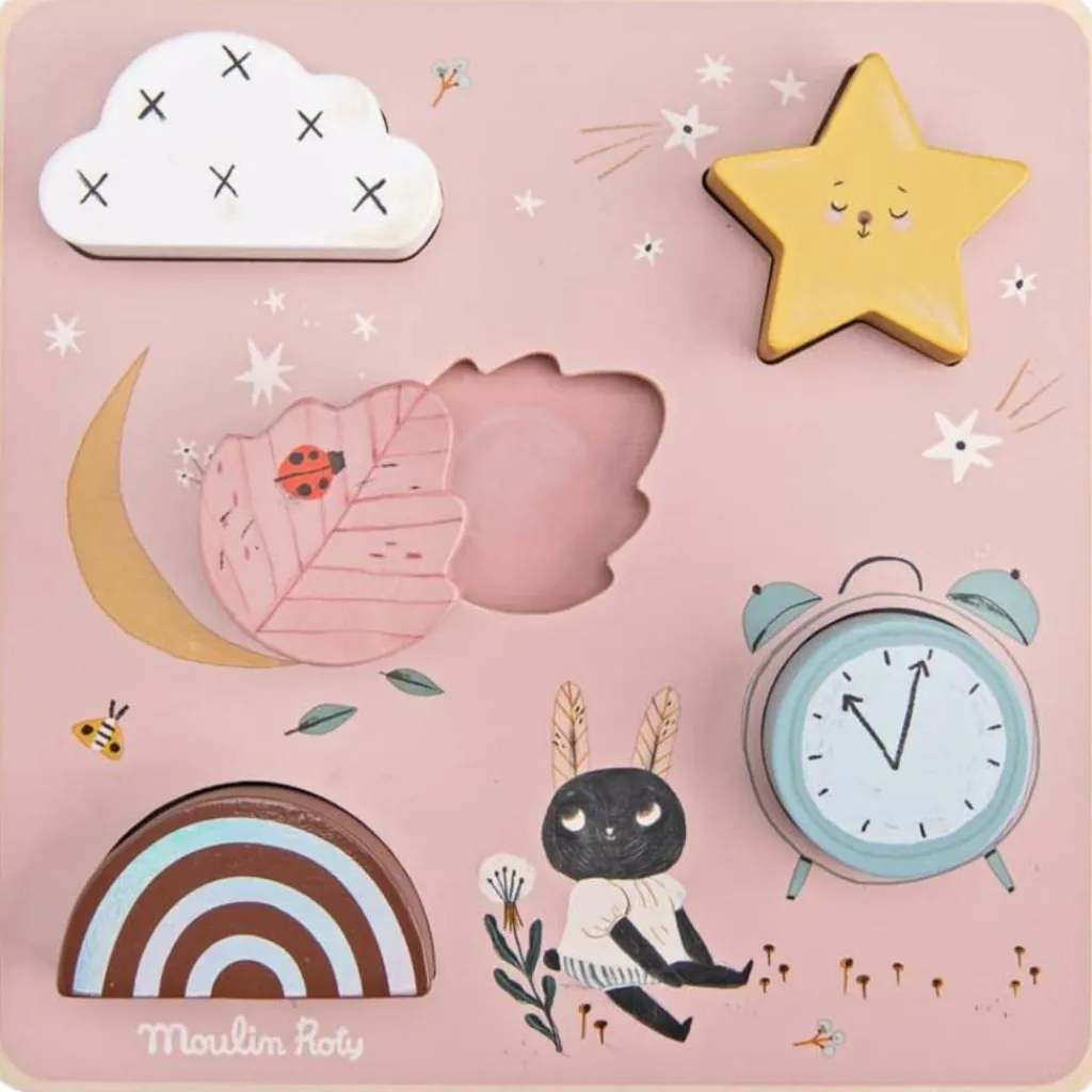 – Ce puzzle sensoriel, composé de 5 pièces encastrables de la collection Après la Pluie, est parfait pour découvrir les formes, les couleurs et les textures.