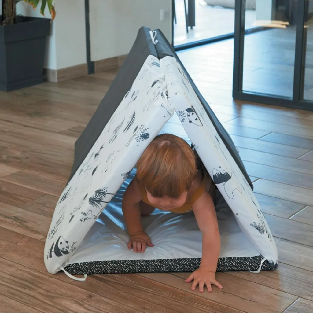 – 5 en 1 : tapis de jeu, matelas d’appoint, pouf, tunnel ou cabane.