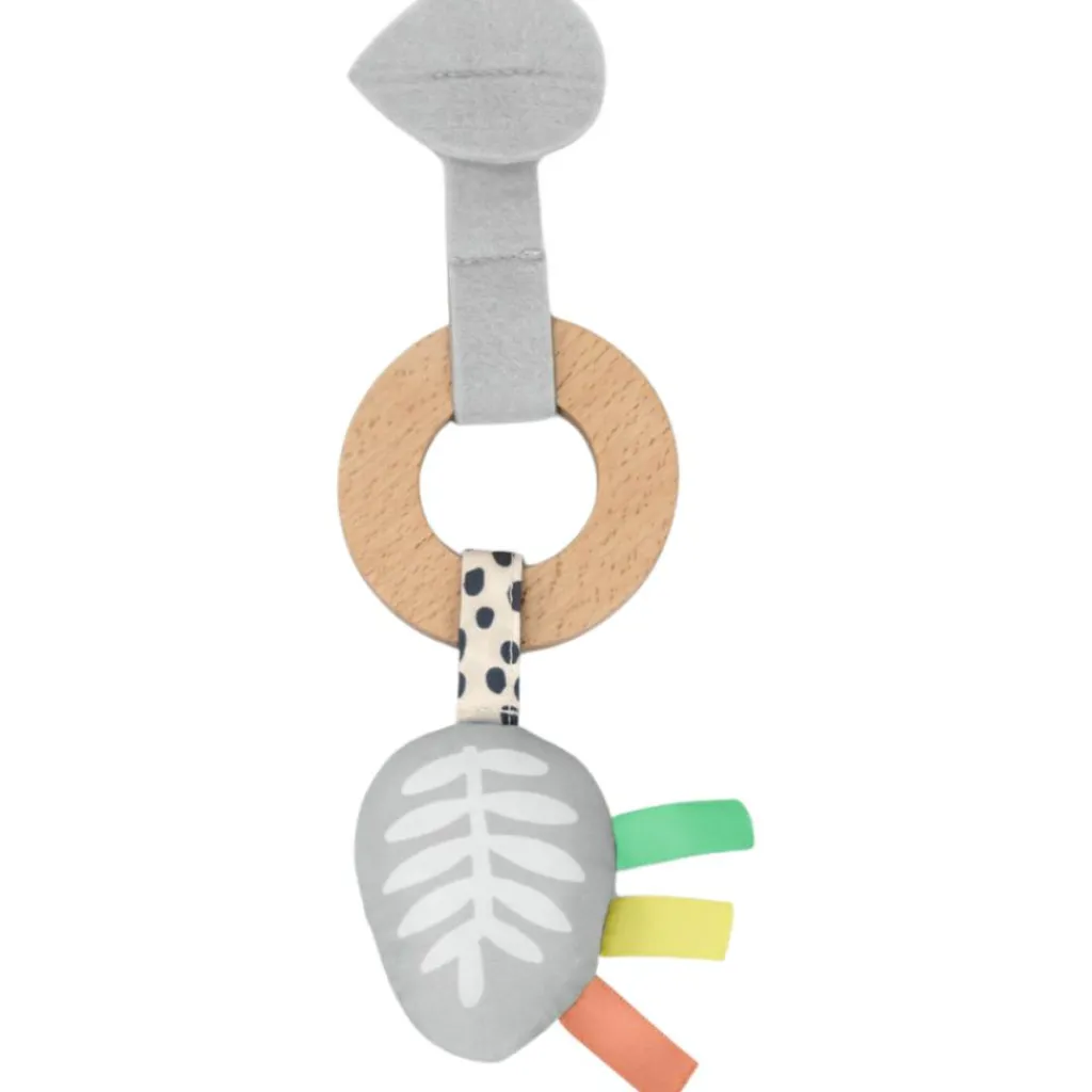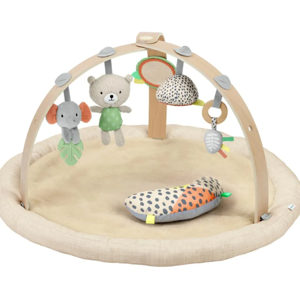 – Muni d’une arche de jeu en bois avec 5 jouets d’activité amovibles : deux jouets sensoriels en peluche, un anneau en bois avec un ruban sensoriel et deux miroirs.