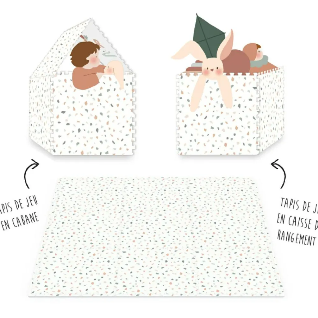 – 2 en 1 : tapis de jeu puzzle, boîte de rangement.