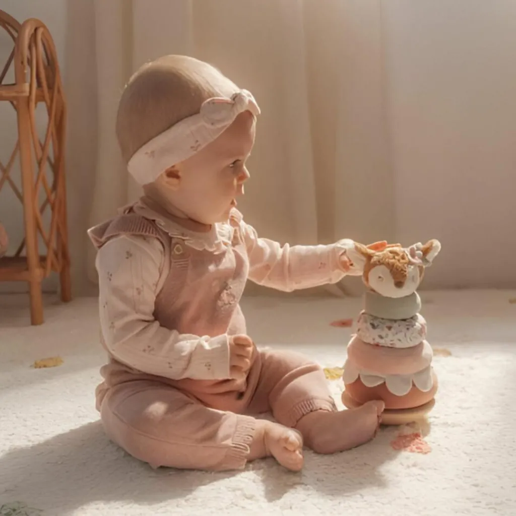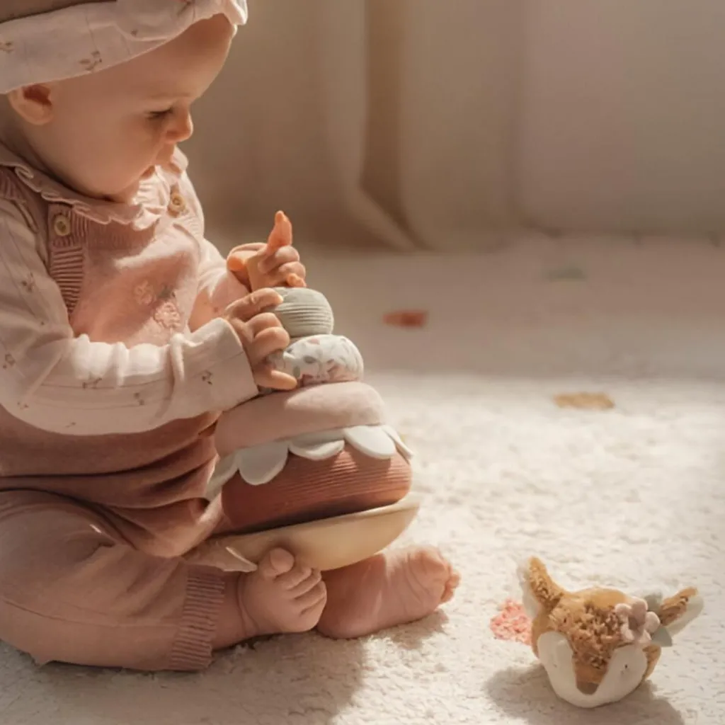 Un compagnon d’éveil tendre et durable : Le faon à empiler Fairy Garden de Little Dutch accompagne bébé dès ses premiers jeux, avec