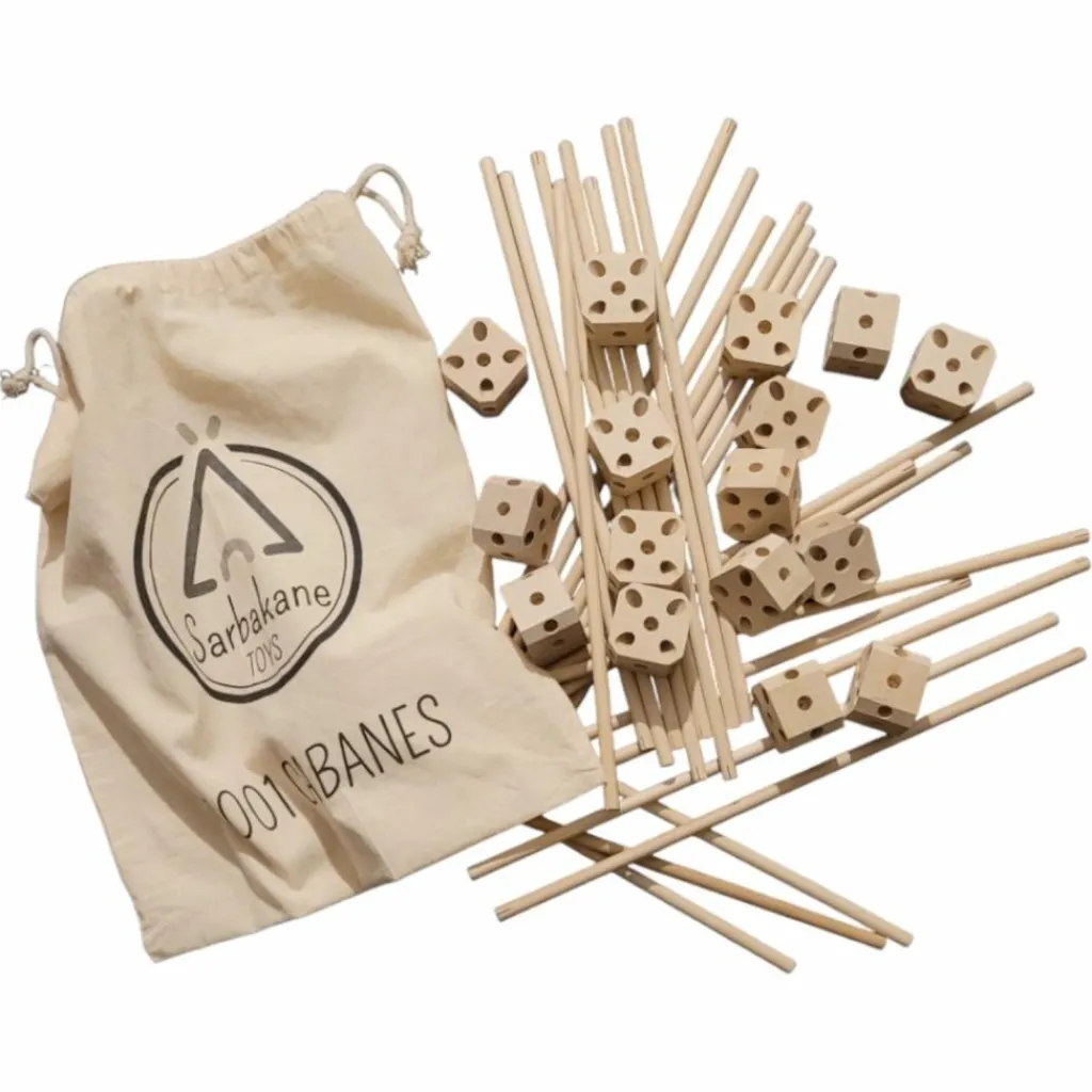 – Des pièces en bois brut – Comme tous les kits de construction 1001 Cabanes, ce pack contient 2 modèles de pièce en bois : des tiges et des connecteurs en forme de pavé rectangulaire percés de 18 trous.