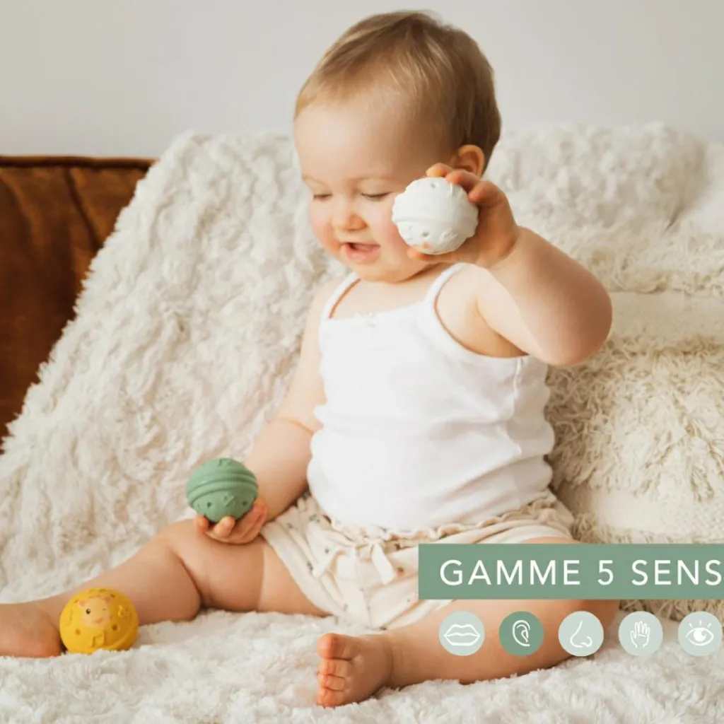 – 3 balles musicales aux sons différents pour stimuler le sens de l’ouïe de bébé.