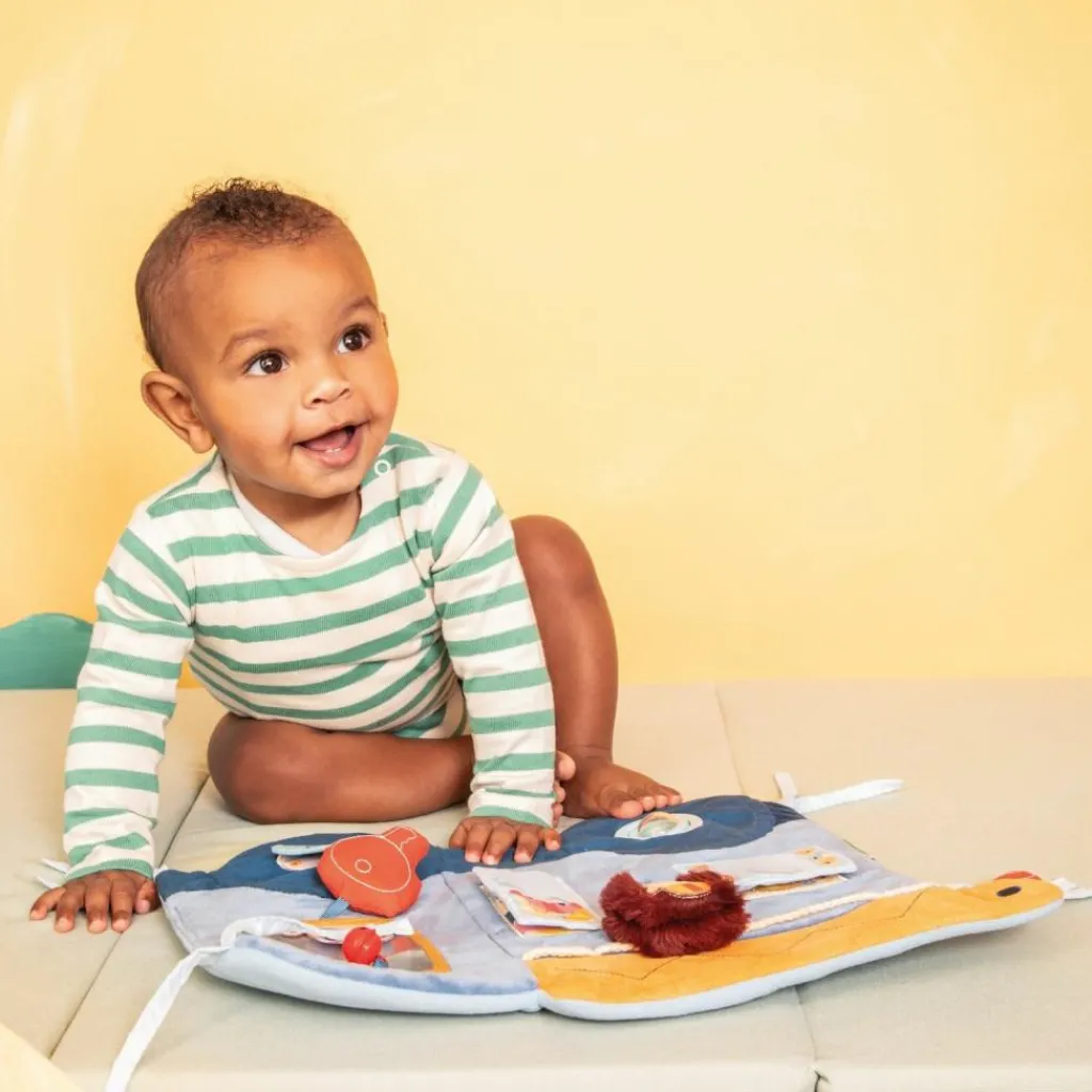 – Avec ses divers surprises visuelles, tactiles ou sonores, ses matières variées et colorées, ce jouet est un vrai atout pour l’éveil de bébé.