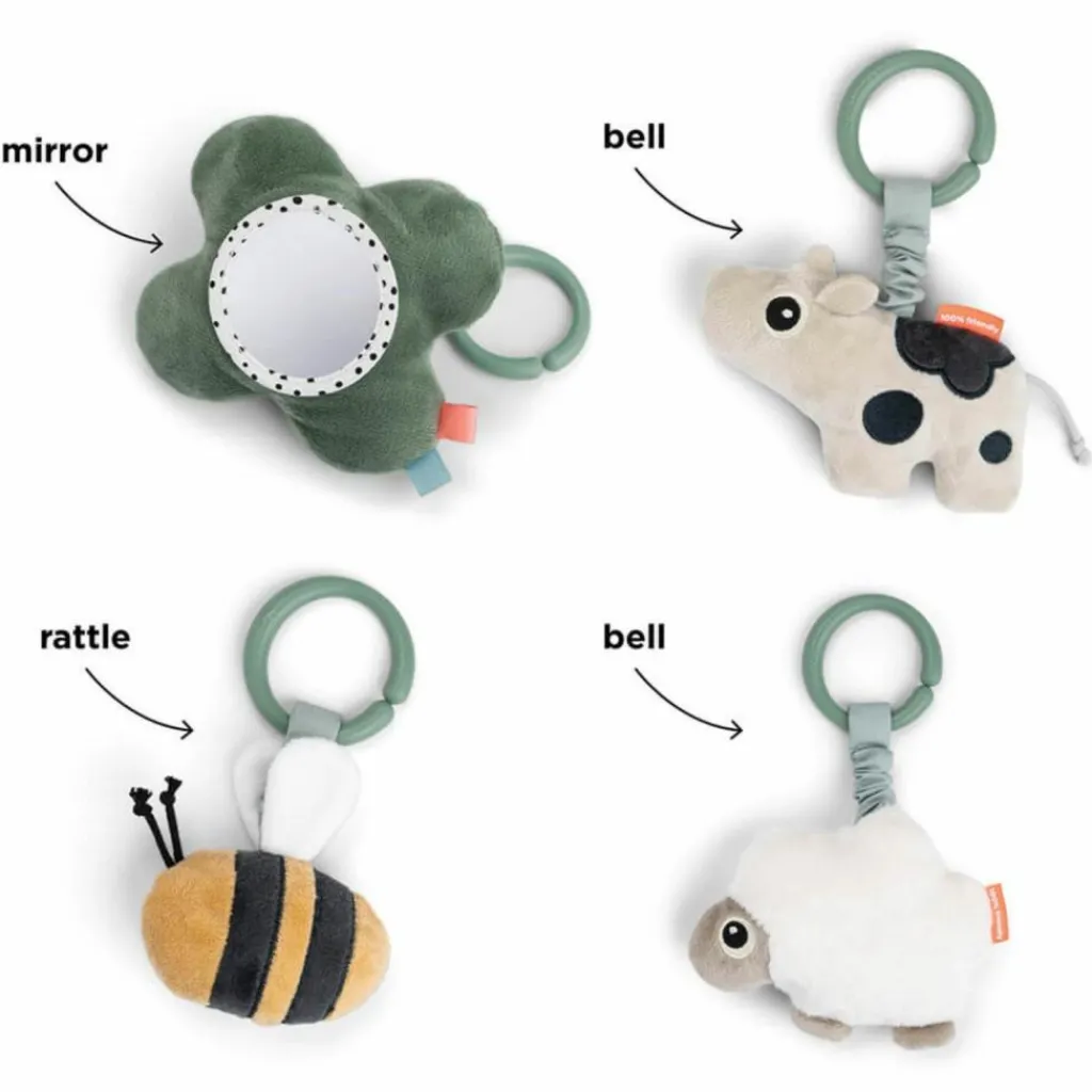 – Bébé découvrira des éléments sensoriels comme un hochet, une clochette, du papier bruissant et un miroir pour stimuler son ouïe et son sens du toucher.