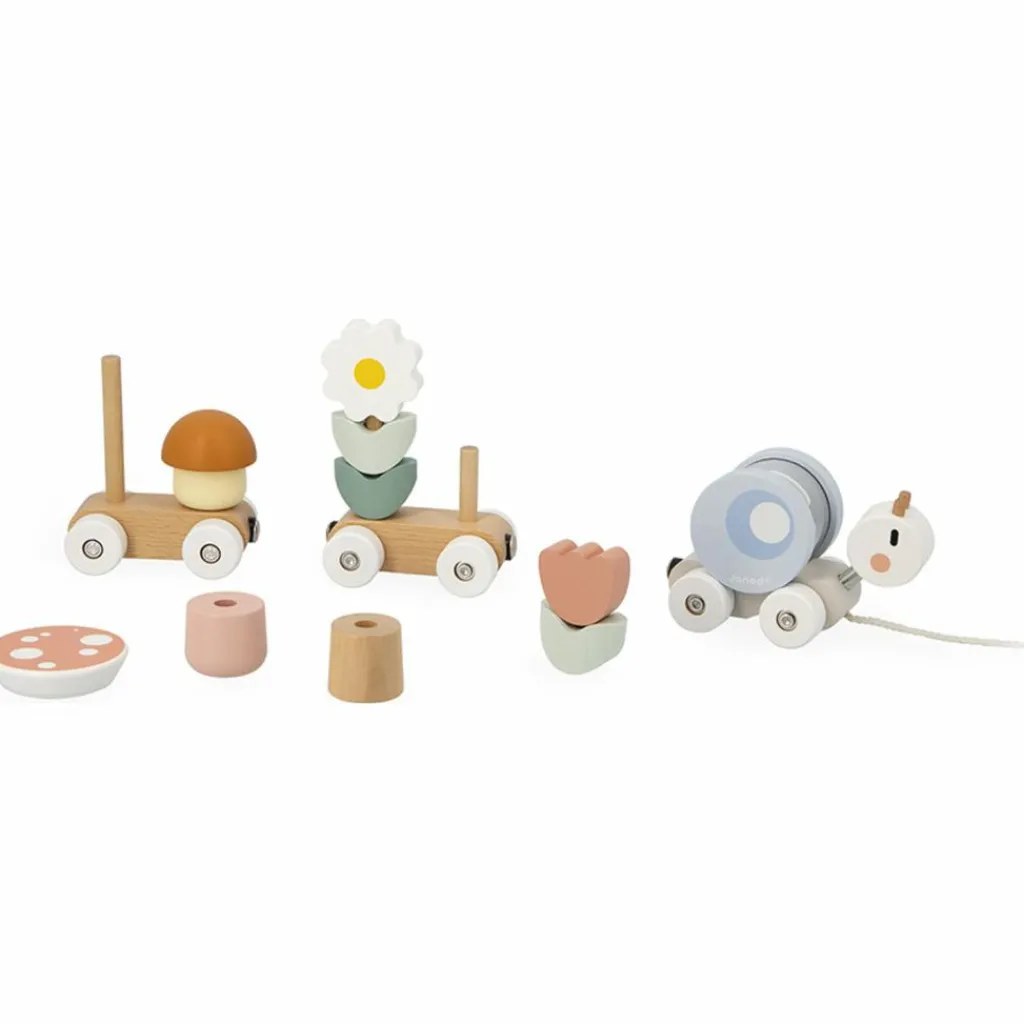 Embarquez pour de joyeuses aventures avec le Train d’activités à tirer Sweet Cocoon de Janod, un jouet d’éveil en bois aussi ludique qu’évolutif !