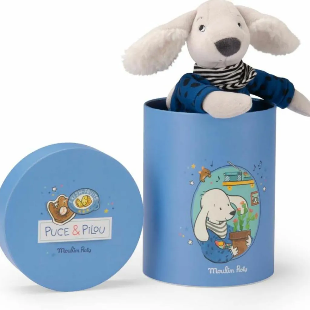 – Pilou attend sagement dans une boite toute ronde joliement illustrée.