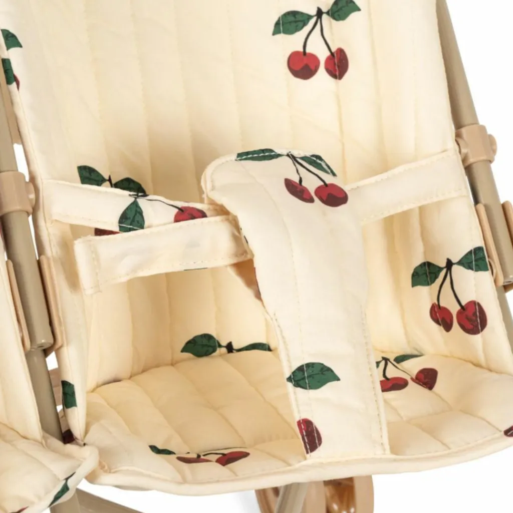 Avec son tissu crème imprimé de jolies cerises rouges et sa structure légère couleur sable, cette poussette pour poupées allie douceur et praticité. Conçue spécialement pour transporter deux poupées, elle permet aux enfants d’imaginer de tendres balades avec leurs compagnons préférés. Grâce à son assise rembourrée et ses ceintures de maintien, chaque poupée profite d’un confort optimal. Légère et facile à manier, elle deviendra vite l’accessoire incontournable des petits parents en herbe.