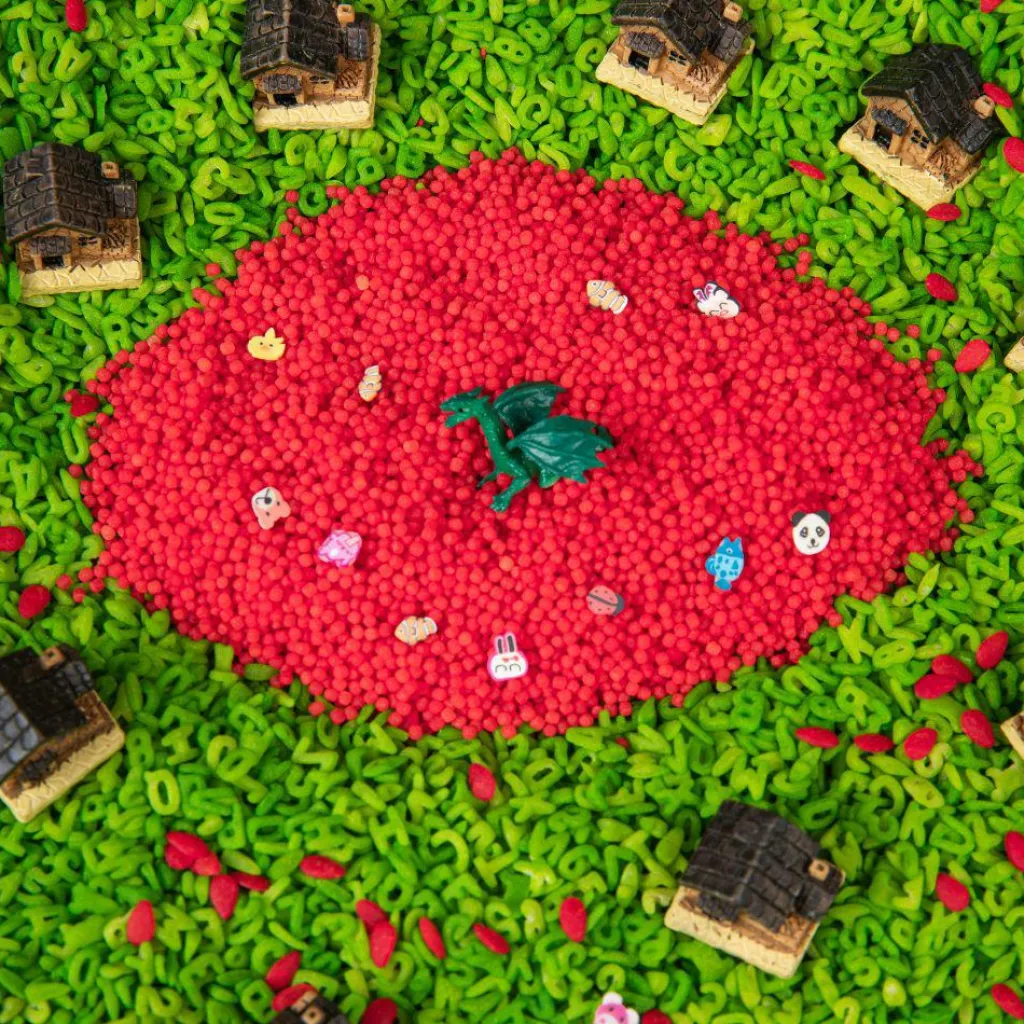 Remplie de détails enchanteurs tels qu’une mini-maison en bois, un dragon miniature, et des éléments colorés rappelant des flammes et des écailles, elle stimule la curiosité et l’imagination.
