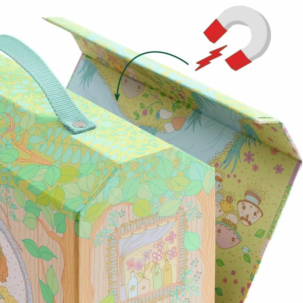 – Une poignée en tissu tissé solide et une boîte avec une fermeture aimantée pour emporter partout la maison des bois Tinyly.