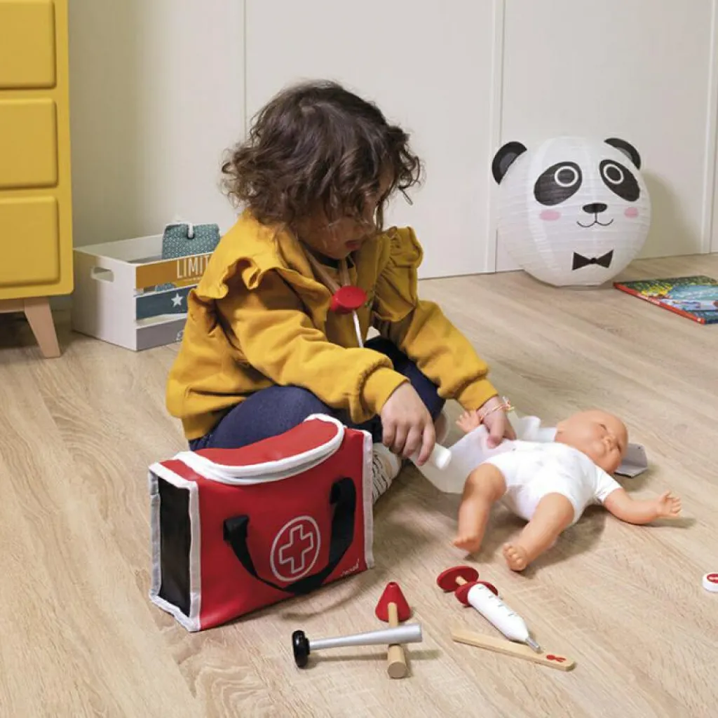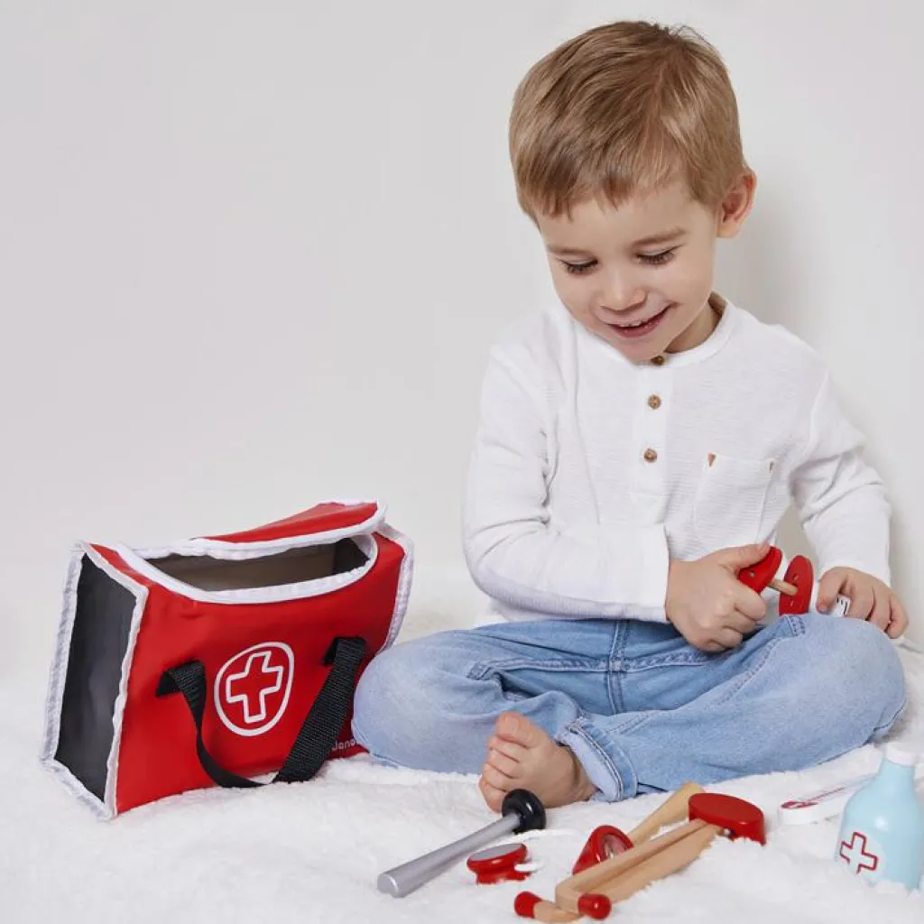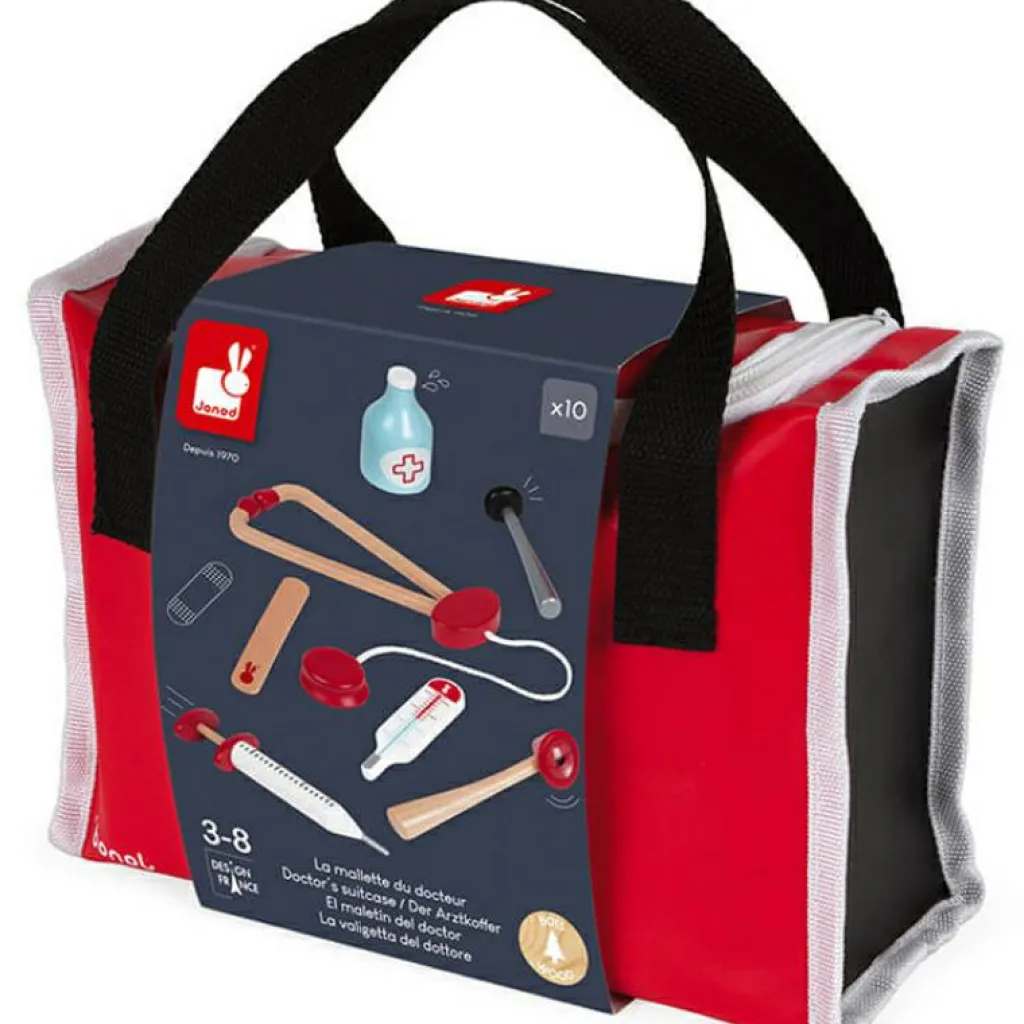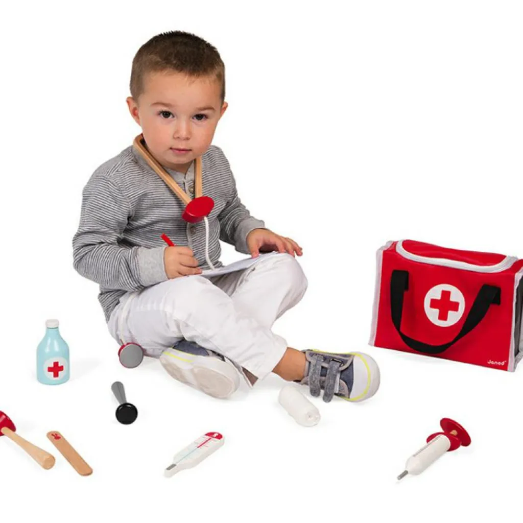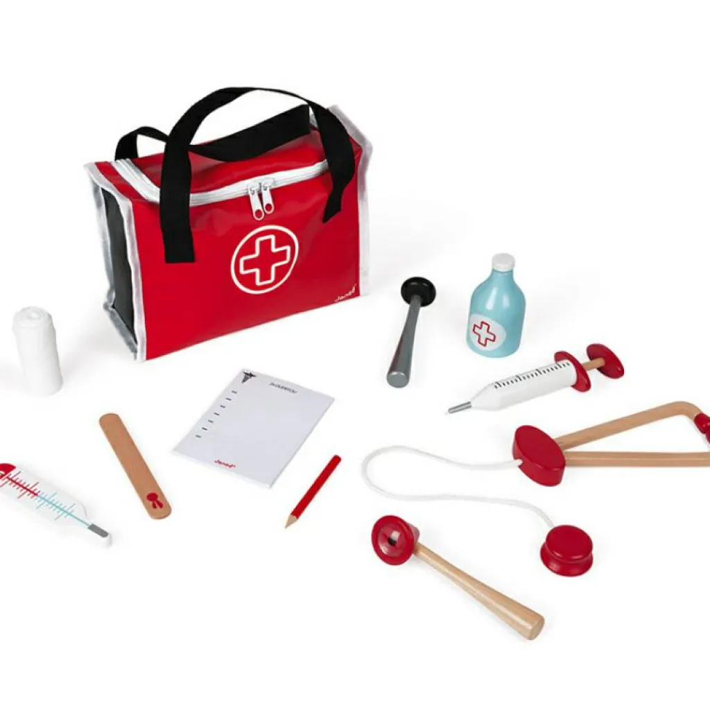 – 10 accessoires : seringue à ressort, marteau réflexe, bouteille de désinfectant, stéthoscope, otoscope avec loupe, thermomètre, languette, calepin d’ordonnance 30 pages avec crayon à papier, rouleau de bandage.